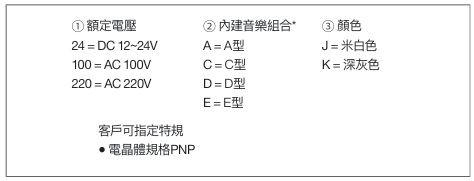 | 頻道選擇方式 | 從旋鈕「A」到「H」中任選其一 透過訊號輸入選擇任一音樂組合 使用SD卡(SD-2GP),隨選8個內建蜂鳴聲可做為專屬音樂組合 |