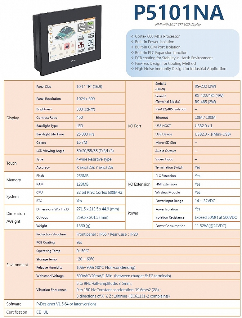 FATEK P5101系列10.1吋人機特色與規格 P5101SA 10.1吋人機 標準型 P5101NA 10.1吋人機網路型 P5101ZA 10.1吋人機進階型 P5101_DataSheet 型錄_P5101NB_DataSheet_TW 型錄_P5101SB_DataSheet_TW 型錄_P5101ZB_DataSheet_TW 永宏P5系列HMI P5 系列人機介面 中文型錄 連線手冊_HMI Connection Manual_TW 歡迎您透過LINE直接詢問或報價: 可搜尋LINE ID:@yuyou