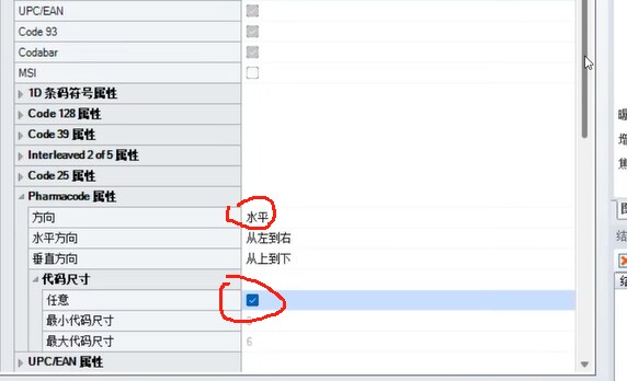 ► 代碼高級 Pharmacode 屬性-方向 (水平/垂直/任意 - 代碼尺寸 - 勾選任意)。