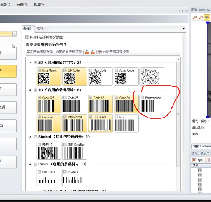 ► 啟用 Pharmacode ,主頁-代碼細節-1D(啟用的條碼符號) 勾選 Pharmacode 。