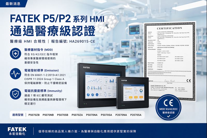永宏 FATEK P5/P2 系列 HMI 通過醫療級認證,涵蓋 MDD 93/42/EEC、EN 60601-1-2 與 CISPR 11 等測試標準,適合醫療設備與高可靠度人機介面應用。