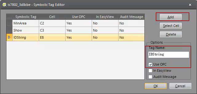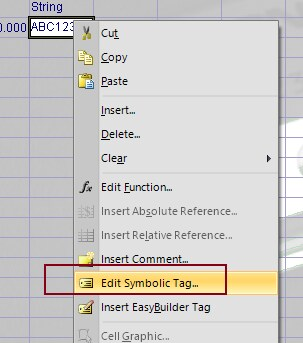 透過右鍵點擊儲存格並進入「Edit Symbolic Tag. 」來設定OPC 標籤
