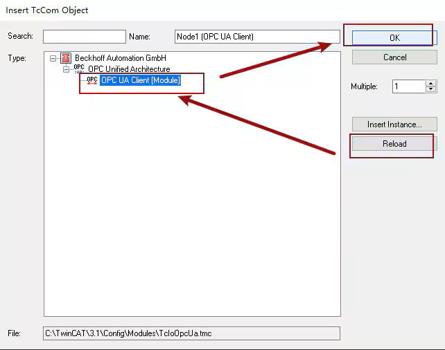 點選「Reload」按鈕,選擇「OPC UA Client」,然後點選「OK」按鈕。